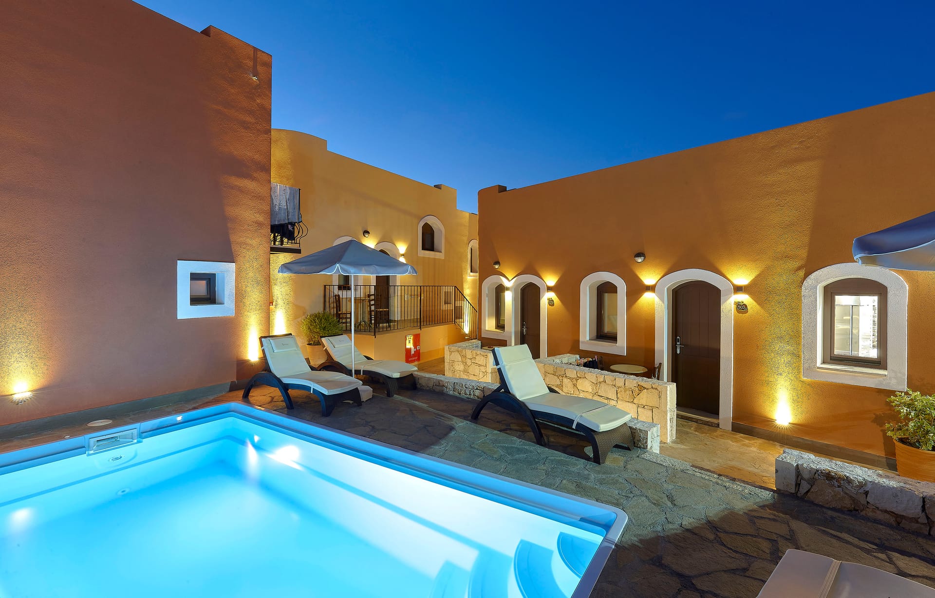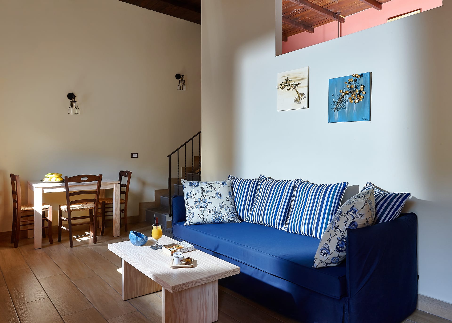 Each Signature Split-Level Suite offers a private and peaceful retreat, with contemporary interiors inspired by earthy tones, natural textures, and clean lines that reflect the surrounding landscape of Koutouloufari.